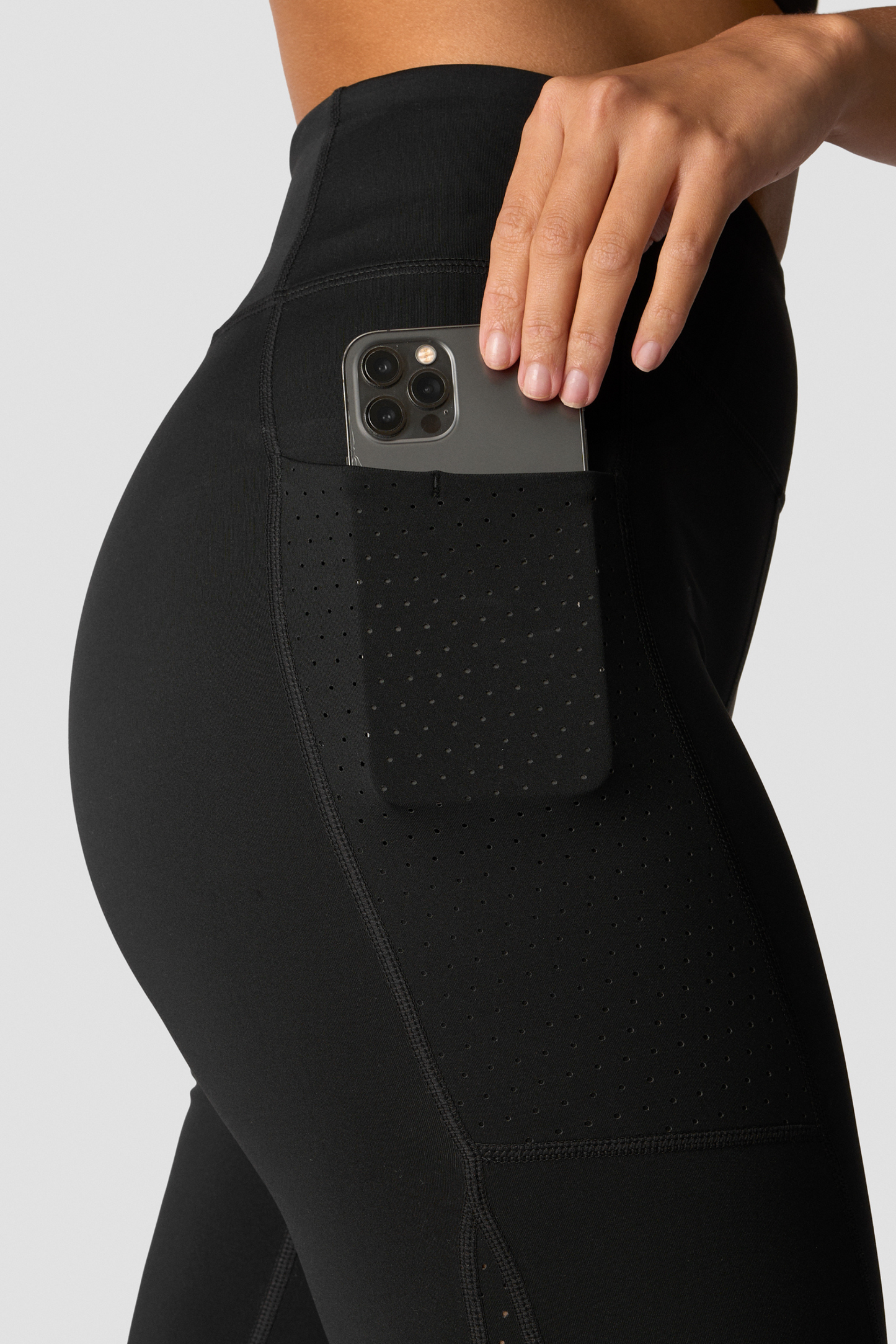 Leggings con tasche per il telefono. Il materiale è molto elasticizzato con proprietà traspiranti e perforazioni tagliate al laser per la ventilazione. Le tasche laterali tengono i tuoi effetti personali vicini. Sottile elastico in vita per mantenere i leggings in posizione.