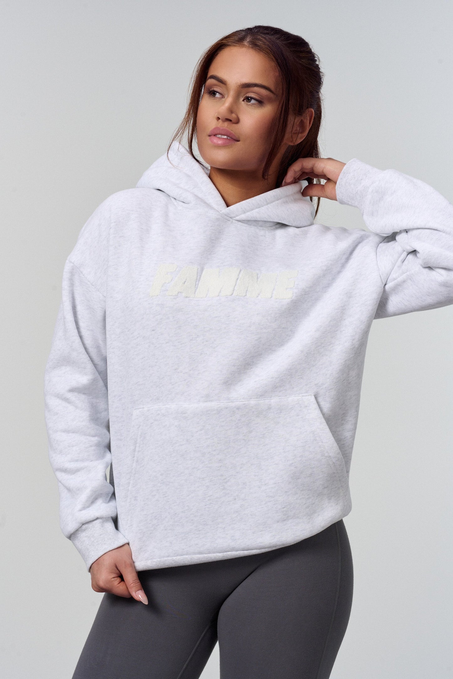 Materiale Ultramorbido CottonTech™️ e vestibilità oversize. Pensavi che il centro fitness fosse un po' freddo? Inizia il riscaldamento con stile e comfort. C'è ampio spazio per un reggiseno sportivo e una t-shirt sotto la felpa con cappuccio. La felpa è comoda da indossare quando hai finito l'allenamento. Un elegante e sottile ricamo in ciniglia con Famme.